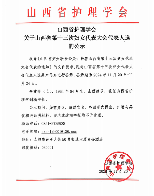 山西省护理学会关于山西省第十三次妇女代表大会代表人选的公示